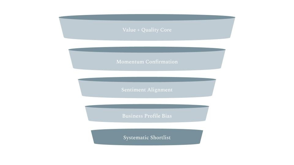The Systematic Shortlist is built to be boring in the best way. Every company has to clear four independent filters because it forces overlap: when value, quality, and trend all agree, the “why” stops being a debate and starts being a rules-based decision.